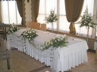 — оформление стола молодоженов цветами и тканями;